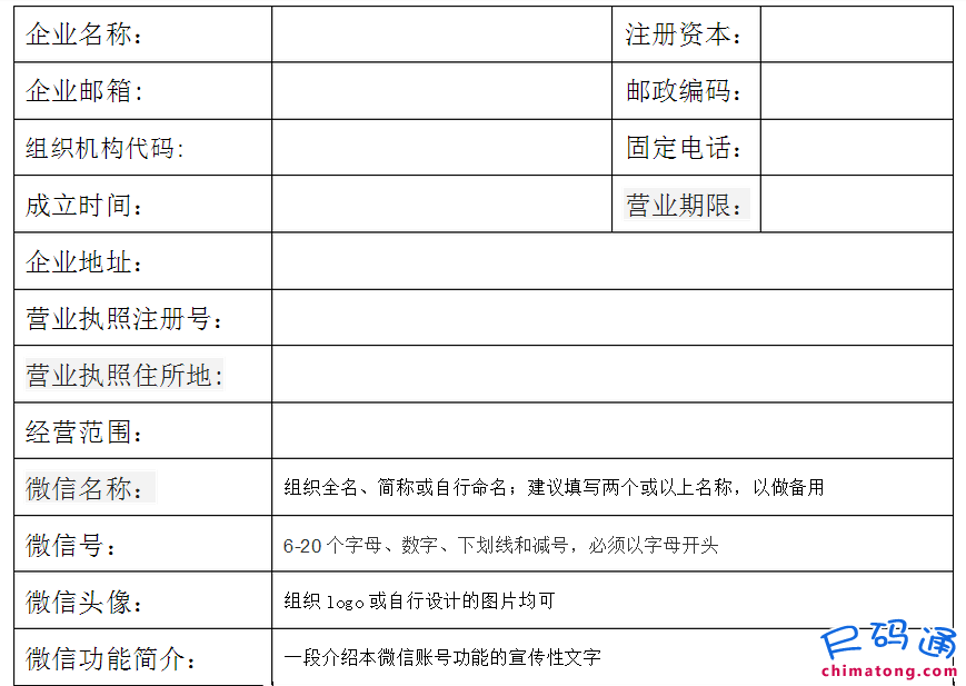 一、企业微信公众账号申请所需资料表